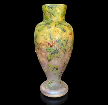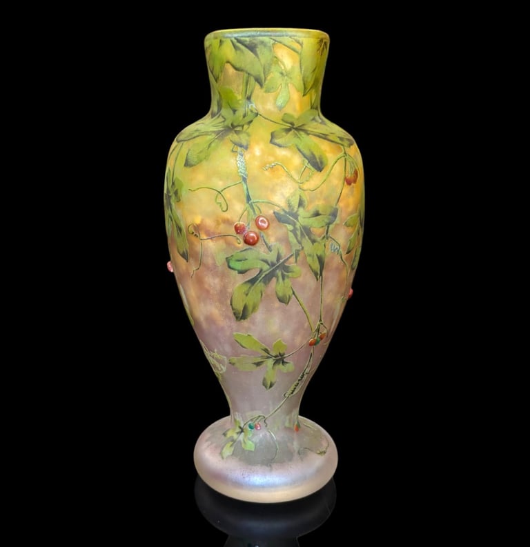 La sélection présentée rassemble des vases en verre français du début du XXe siècle, représentatifs des courants Art Nouveau et Art Déco. L’accent est mis sur la richesse des décors, la maîtrise des techniques verrières — notamment le verre multicouche — et la qualité des finitions. Ces vases sont attribués ou signés par des maisons et verriers de premier plan, emblématiques du savoir-faire verrier français.